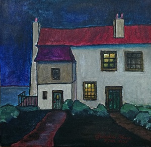 2025Een wit huis aan zee, met een rood dak, in de nacht maar er brandt nog licht.