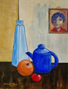 Stilleven met blauwe theepot, vaas, sinaasappel en tomaat, met op de achtergrond een portret.